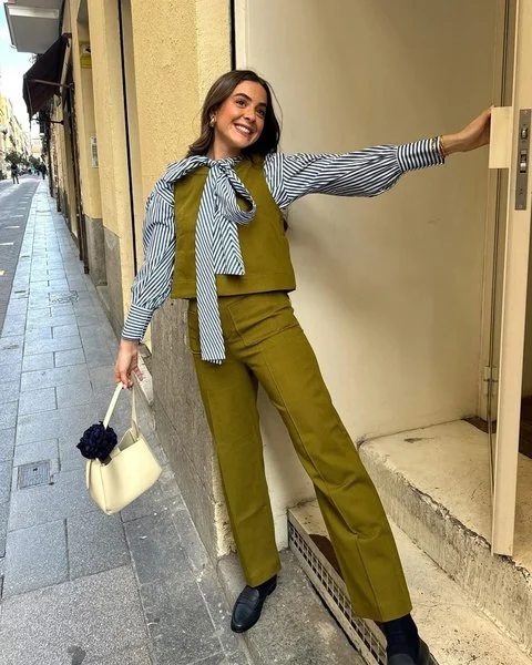 Zastrčený přední díl košile opticky prodlouží nohy a zvýrazní pas, aniž by outfit působil příliš formálně